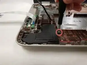 С помощью металлической лопатки отогните два резиновых ножки, расположенные ближе к петле, чтобы получить доступ к двум винтам Phillips #0 длиной 6,6 мм.
