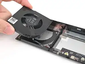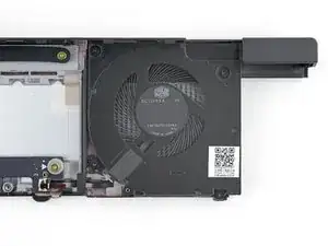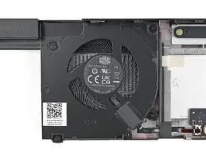 Ослабьте четыре удерживаемых шурупа Torx T5, фиксирующие правый вентилятор, с помощью отвертки Framework.
