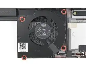 Используйте отвертку Framework, чтобы затянуть четыре закреплённых винта Torx T5, фиксирующих правый вентилятор.