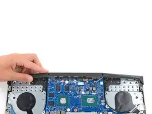 Используйте острый конец лопатки, чтобы вывести кабель дисплея из защёлок на нижнем крае левого вентилятора.