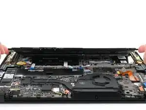 Удерживайте крышку основания по краю шарнира экрана и медленно поднимите, чтобы освободить оставшиеся зажимы.
