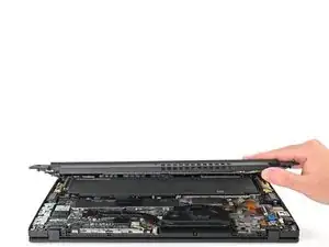 Вставьте ноготь или лопатку для открытия в зазор между крышкой основания и панелью клавиатуры, рядом с одним из шарниров экрана.