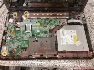 Удалите единственный винт, удерживающий материнскую плату к основанию.