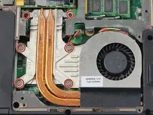 Удалите шесть винтов по 7 мм с помощью отвертки Phillips #1, а затем используйте инструмент для поддевания, чтобы отключить вентилятор перед удалением кулера ЦПУ.
