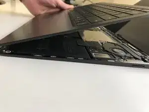 Откройте экран и поднимите клавиатуру. Не требуется большого усилия — деталь удерживается на магнитах после снятия винтов.