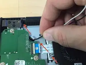 Разомотайте/удалите чёрный и белый провода из их оригинального черного фиксатора, который закреплён вокруг вентилятора. Также есть один металлический зажим, прикреплённый к нижней части подставки для ладоней. (См. фото 3)