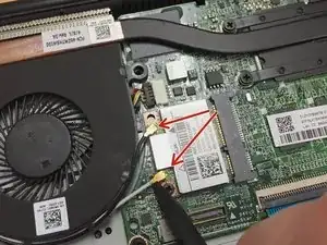 После того как провода закреплены и проплетены через фиксаторы вентилятора, возьмите золотистые коннекторы на концах проводов и защёлкните их на оба порта, прикреплённых к плате Wi‑Fi. (См. видео)