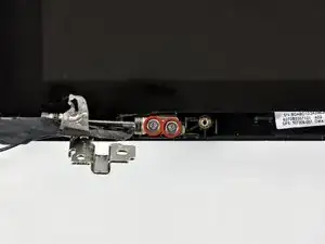 Удалите два винта Phillips 4,5 мм, фиксирующие левую петлю дисплея к дисплею.