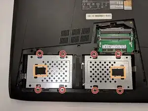 Отверткой PH1 удалите винты, фиксирующие жесткие диски.