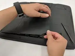 Пинцетом снимите четыре верхних резиновых заглушки, расположенные на нижней части корпуса ноутбука.
