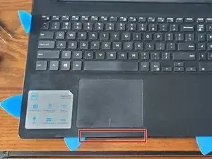Используя медиаторы или такие же инструменты, аккуратно и медленно вставьте один между двумя слоями ноутбука. Существует нижняя крышка, которая округляется до верхней, и затем подставка для запястья, стыкующаяся с ней на самом краю. Я рекомендую медленно и осторожно вставлять медиатор там, где подставка для запястья углубляется под тачпадом, отмеченным красным прямоугольником.