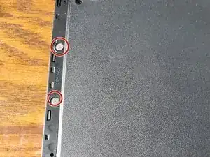 Необходимо удалить 2 винта, отмеченных красным. Используя отвертку, снимите нижний винт и открутите боковой. Боковой винт самозакрывающийся.