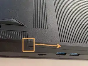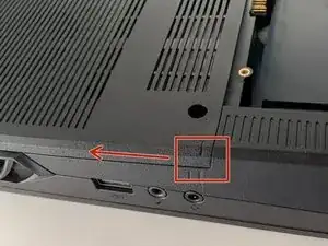 Чуть сдвиньте крышку вверх, чтобы освободить зажимы, удерживающие её на месте. Это вид справа. Метка на крышке должна теперь совпадать со второй меткой на корпусе компьютера.