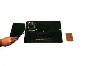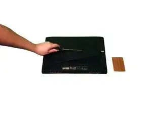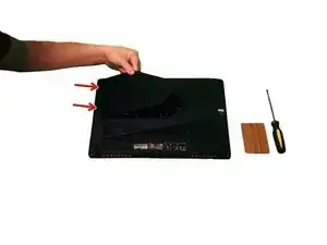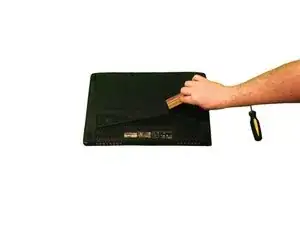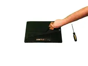 С помощью пластикового лопаточного инструмента осторожно приподнимите крышку на нижней панели, начиная с места, где находился винт.