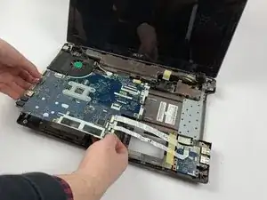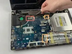 Потяните за коричневый язычок пинцетом, пока он полностью не отсоединится, и снимите материнскую плату.
