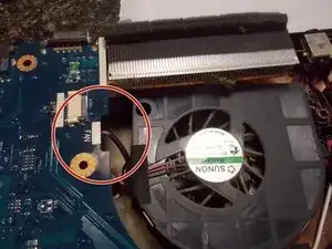Отсоедините шлейф, соединяющий клавиатуру с материнской платой, нажав на чёрный фиксатор вниз и вытянув шлейф наружу.