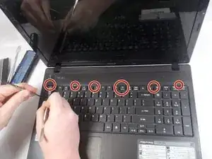 Вставьте инструмент для вскрытия или лопатку iFixit между боковой частью клавиатуры и корпусом ноутбука и слегка приподнимите клавиатуру.