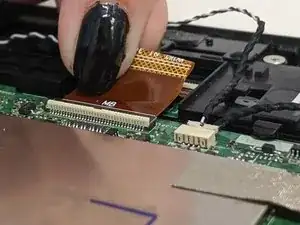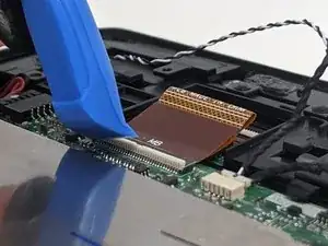Отсоедините ленточный кабель материнской платы и подденьте лопаточкой фиксатор кабеля.