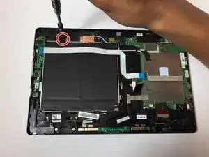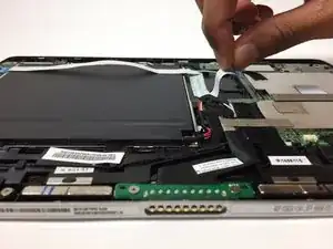 Снимите кусок тонкой черной ленты, прикреплённой к плате с другой стороны аккумулятора.