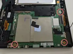 Теперь, когда батарея удалена, пора отключить оставшиеся ленточные кабели и разъёмы (обозначены красным) от материнской платы.