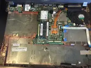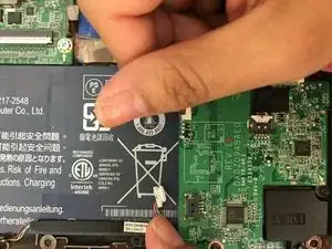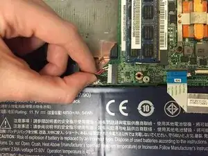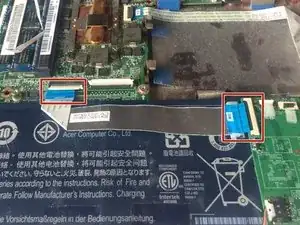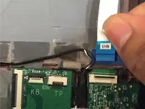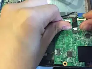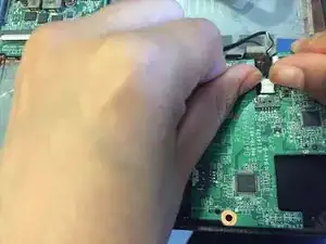 Аккуратно приподнимите покрытые чёрной изоляцией кабели, которые остаются подключёнными к материнской плате в нижнем левом углу основания ноутбука.