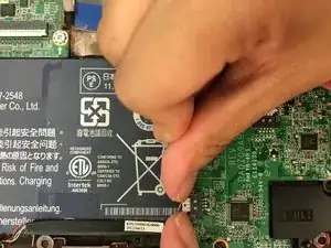 Осторожно приподнимите материнскую плату и сдвиньте аккумулятор влево, чтобы вынуть его.