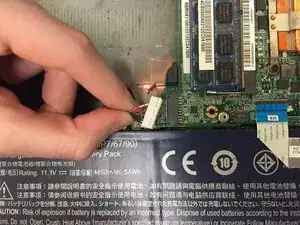 Аккуратно отсоедините шесть объединённых проводов (красный, чёрный и зелёный), подключённых к аккумулятору и материнской плате, сжав их большим и указательным пальцами. Оттяните с умеренной силой влево, чтобы отсоединить.