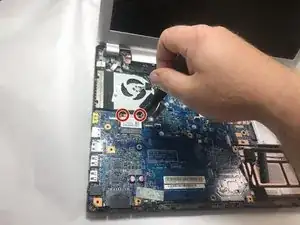 Используйте крестовую отвёртку #0, чтобы выкрутить три винта 2.5 x 4 мм, крепящие вентилятор процессора к материнской плате.