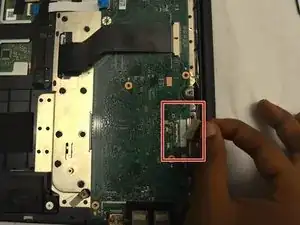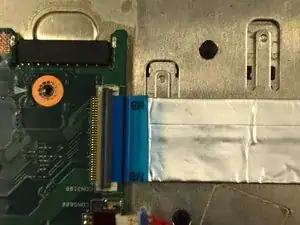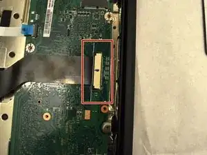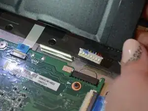 Отключите кабель ЖК-экрана от материнской платы: снимите ленту с разъёма ЖК, затем аккуратно вытяните ленточный кабель.