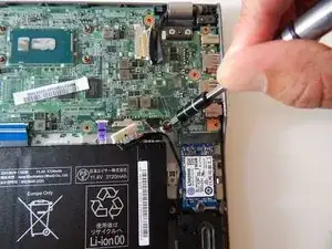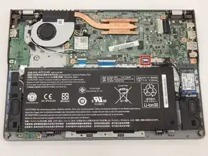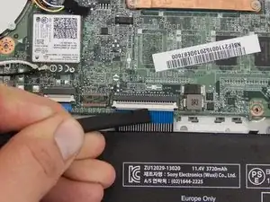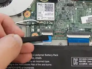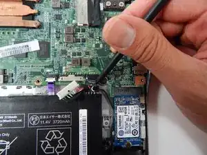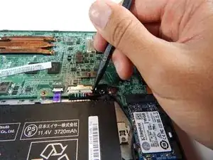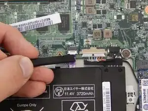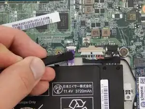 Отсоедините черный разъем, прикрепленный к материнской плате в верхнем правом углу аккумулятора, используя лопатку, чтобы надавить на два L-образных углубления к аккумулятору.