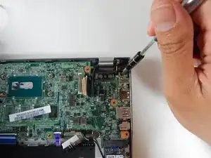 Удалите винт длиной 3.63 мм в верхнем правом углу возле петли с помощью отвертки Phillips #0.