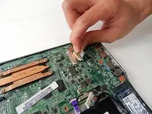 Отключите белый разъем, прикрепленный справа от вентилятора, с помощью лопатки, приложив усилие к аккумулятору на два L-образных углубления.