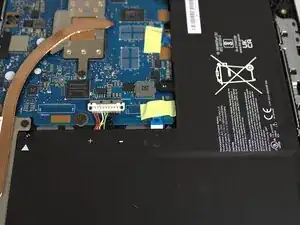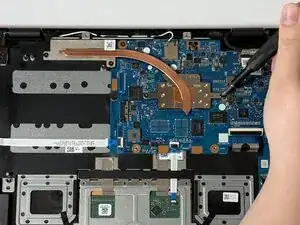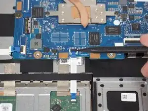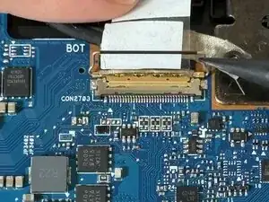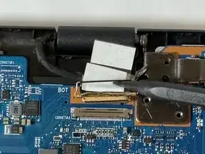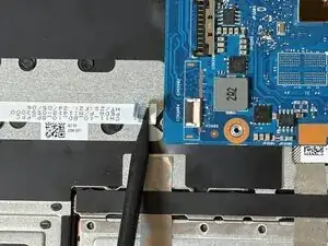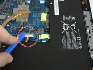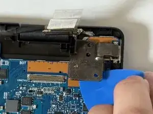 С помощью монтажной лопатки iFixit подденьте петлю, удерживающую материнскую плату на месте.