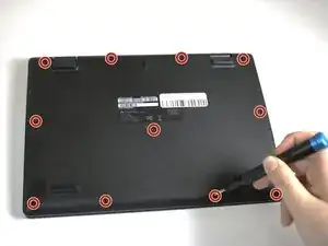 С помощью отвертки JIS #1 снимите одиннадцать винтов 6,6 мм с задней крышки.