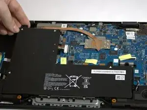 Поднимите и извлеките аккумулятор из ноутбука.
