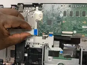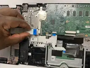 Отключите ленточный кабель тачпада, приподняв защёлку и вытянув его.