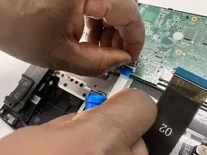 Отключите ленточный кабель дочерней платы, подняв белую защёлку и вытянув кабель из материнской платы.