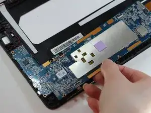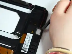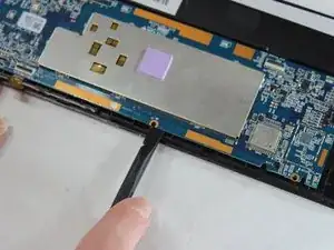 Используйте лопатку, чтобы отделить аккумулятор от клея, которым он прикреплён к экрану. Осторожно подденьте аккумулятор и извлеките его из планшета.