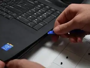 Используйте пластиковый инструмент для вскрытия, чтобы поддеть клавиатуру от основания компьютера.