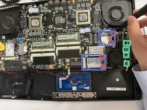 Используйте отвертку Phillips #0, чтобы выкрутить два винта, удерживающие беспроводную карту.