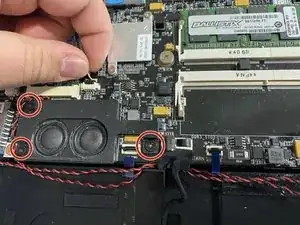 Используйте отвертку Phillips #0, чтобы выкрутить два винта, удерживающие правый динамик.