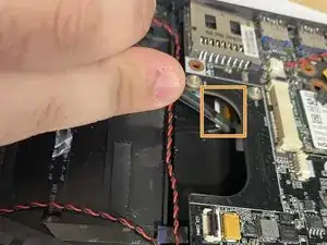 Приподнимите материнскую плату рядом с винтами параллельного динамика, чтобы найти под ней оранжевую ленту. С помощью пинцета с притуплёнными концами аккуратно снимите её.