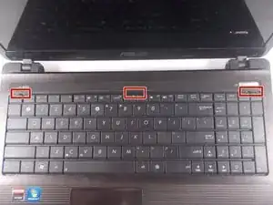 Найдите три кнопки в верхней части клавиатуры, расположенные в зазоре между корпусом и клавиатурой, выделенные здесь красным.