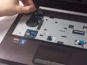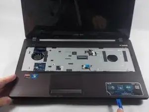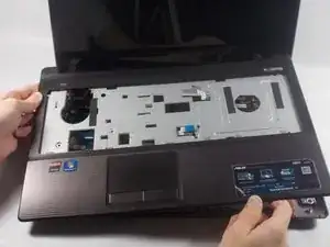Отогните клавиатуру к себе. Она всё ещё будет соединена ленточным кабелем с остальной частью компьютера.