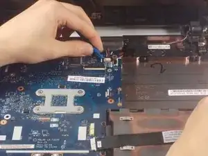 Отсоедините два показанных кабеля от их гнёзд с помощью пластиковой лопатки.