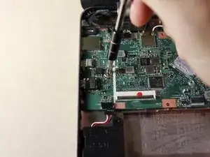 Используйте пластиковый инструмент для вскрытия, чтобы приподнять материнскую плату от основания. Возможно, придётся покачивать её, чтобы освободить.
