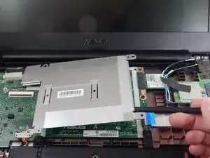 Отсоедините синий кабель, соединяющий материнскую плату с дочерней платой, потянув за синюю язычок кабеля.