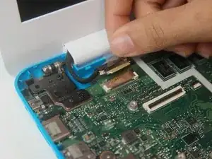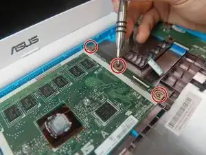 Удалите (3) три винта длиной 4 мм, которые крепят петлю к материнской плате, используя отвертку Phillips #000.