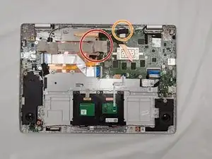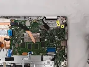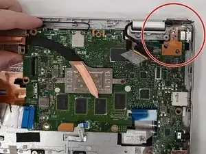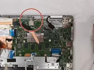Выкрутите три винта Phillips длиной 1,4 мм, крепящие петлю в правом верхнем углу материнской платы.