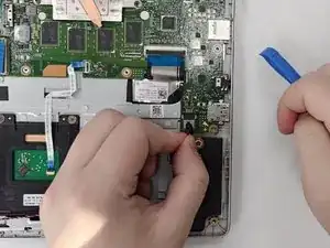 Используйте инструмент для вскрытия, чтобы поднять серебристую фиксирующую пластину, удерживающую разъём батареи.